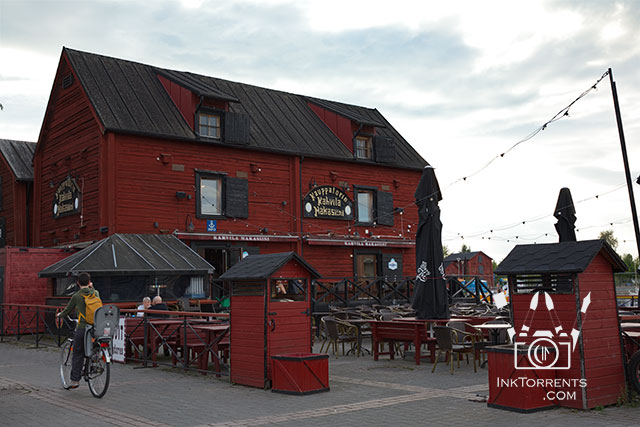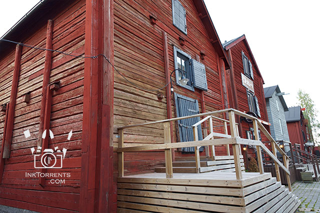 From Rovaniemi, instead of going directly to Kajaani, we decided to first go east to Oulu.   Once there, we meandered through the streets toward the market square.  We came across these red wooden storehouses dotting the area.  Some had been converted to restaurants, while others looked like offices.